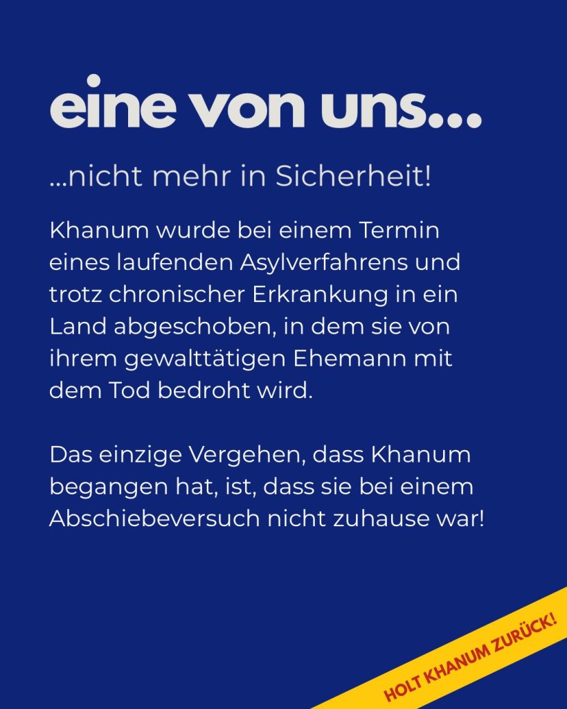 Als Nachbar:innen stehen wir füreinander ein und organisieren uns für eine vielfältige Gesellschaft, in der Menschen ohne Angst und Einsamkeit leben können. Das bedeutet, dass wir uns gegen strukturelle Diskriminierung wehren: Khanum wurde abgeschoben, weil Behörden entscheiden wollen, wer hier hingehört und wer nicht. Sie wurde abgeschoben, weil die rechten Forderungen nach mehr Abschiebungen Gehör finden, und weil Behörden an bedrohten Menschen wie unserer Freundin ein Exempel statuieren wollen. Sie wollen zeigen, dass sie die Schwächsten gegeneinander ausspielen. Dazu sagen wir: Das ist rassistische Politik! Das ist falsch! Denn wir wissen: Frieden und Sicherheit entstehen nicht durch Abschiebung, sondern dadurch, dass wir füreinander sorgen. Khanum ist eine von uns!