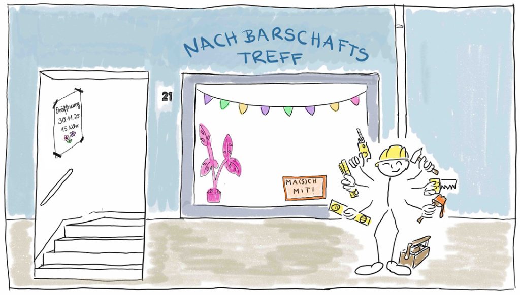 Am 30. November 2025 um 15 Uhr wird die Eröffnung unseres neuen Nachbarschaftstreff sein. Bis dahin laden wir ein zum gemeinsamen Renovieren, Vorbereiten der Feierlichkeit und Mietspenden sammeln.