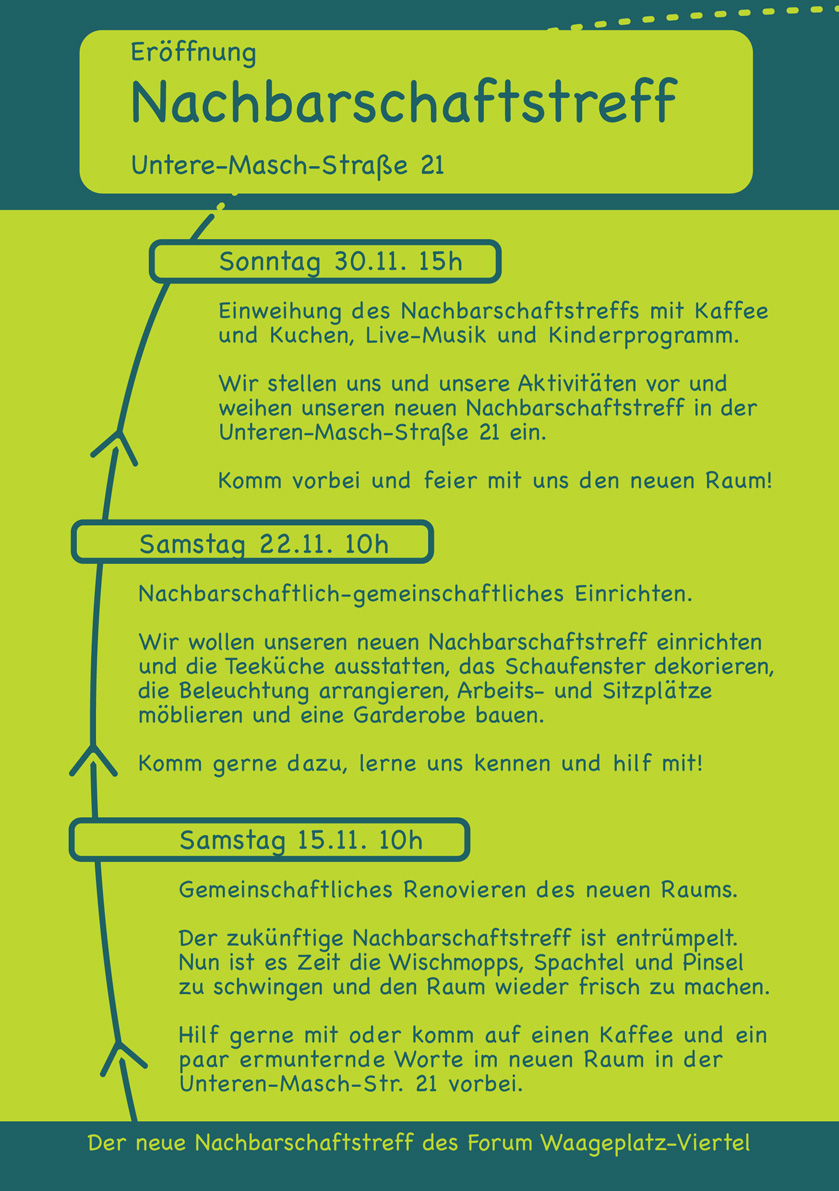 Am 30. November 2025 um 15 Uhr wird die Eröffnung unseres neuen Nachbarschaftstreff sein. Bis dahin laden wir ein zum gemeinsamen Renovieren, Vorbereiten der Feierlichkeit und Mietspenden sammeln.