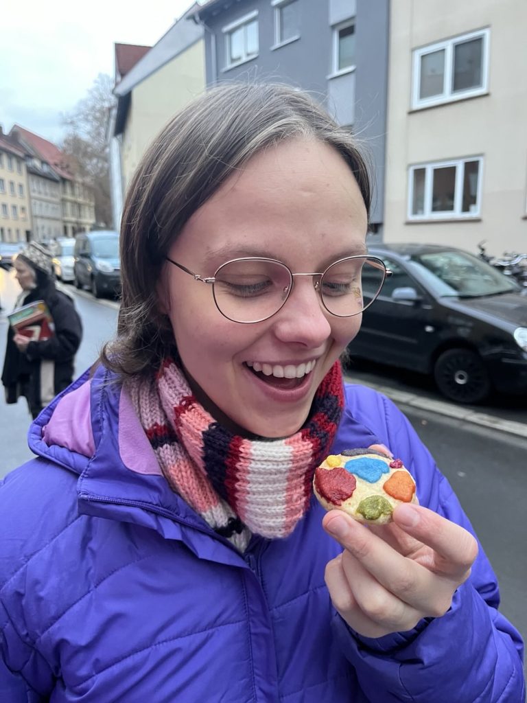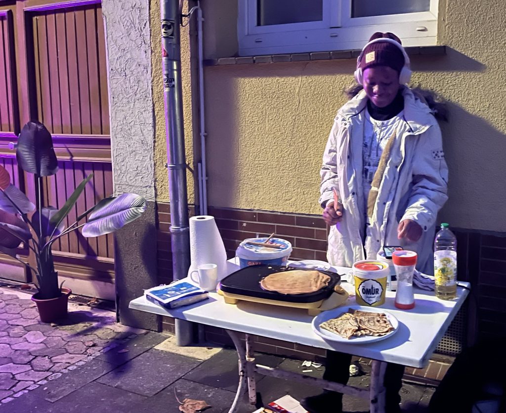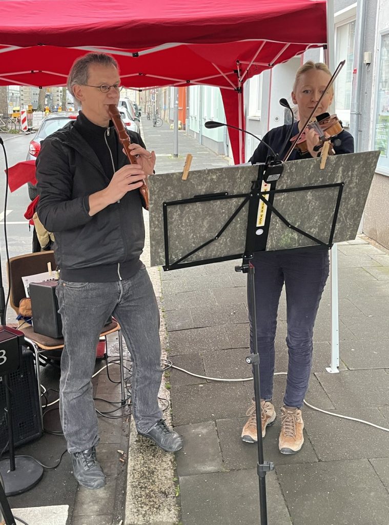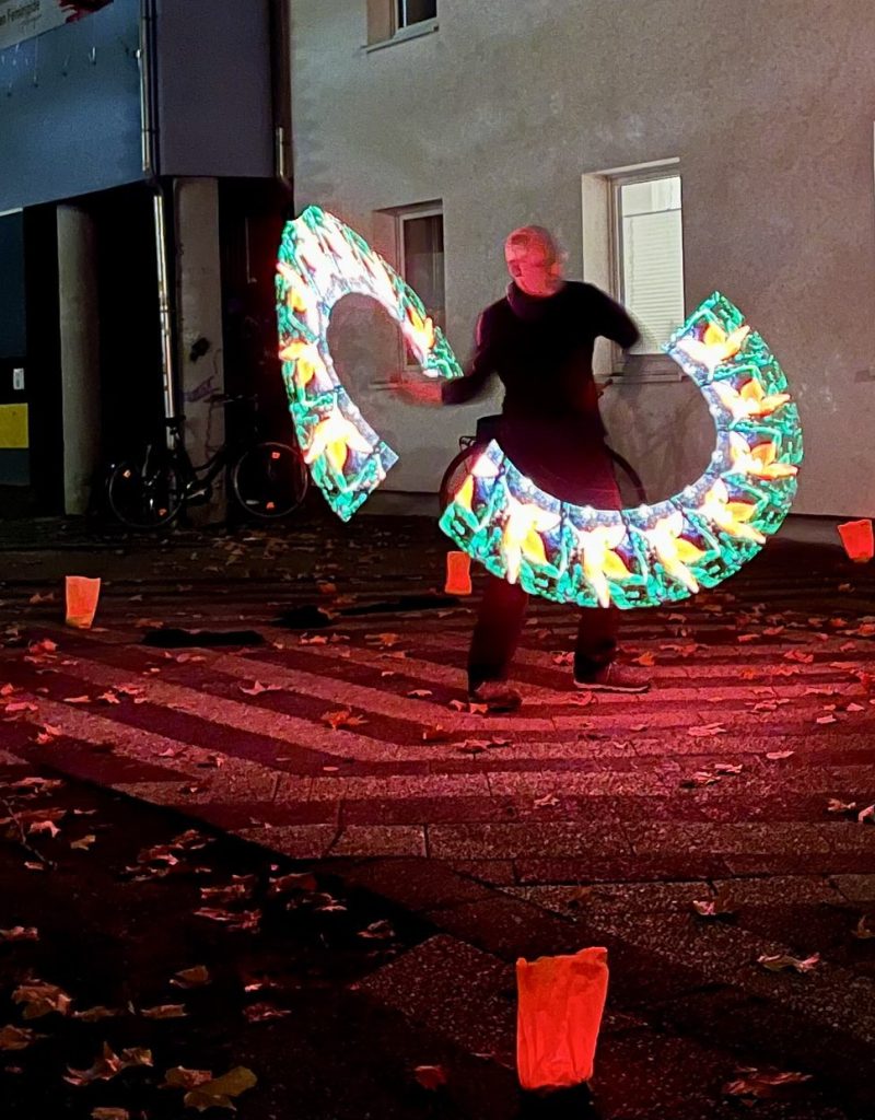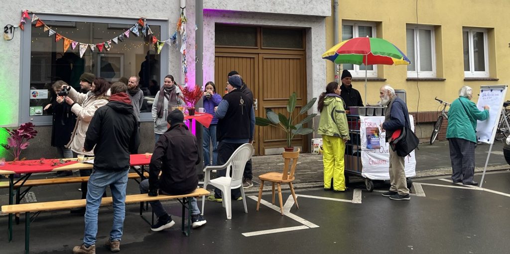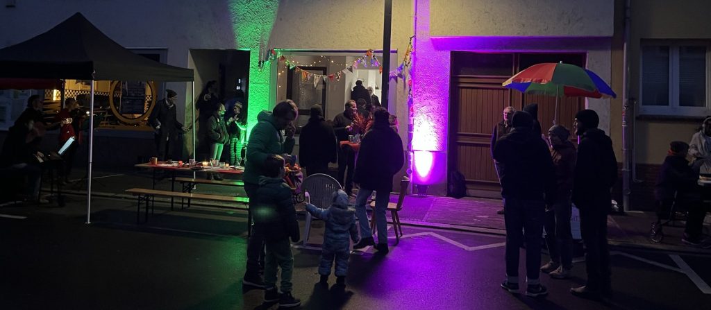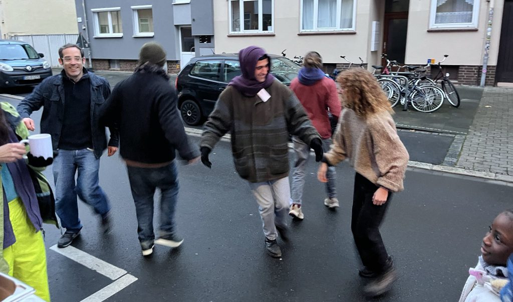 Wir haben heiße Crêpes gegessen und (Logo-)Kekse, die tags zuvor nachbarschaftlich gebacken wurden, haben auf der Straße getanzt und gemeinsam unser neues Lied „Nachbarschaft“ gesungen, es erklang Geigen- und Flötenspiel, Jazz-Musik und zum krönenden Abschluss gab es eine artistische Feuer- und Lichtshow von Bernd van Verven. Die AGs des Forum Waageplatz-Viertel waren ansprechbar und wieder gab es viel zu erzählen und voneinander zu hören, sich kennenlernen, Verabredungen treffen, spielen u.v.m.